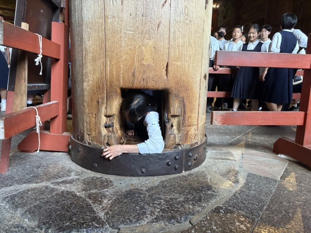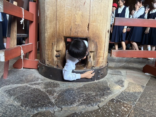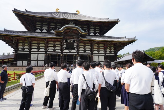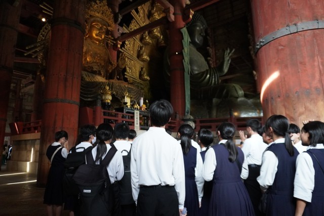 奈良の大仏で知られる「東大寺大仏殿」は、その壮大さと厳かな雰囲気に圧倒されている生徒たちでした。
