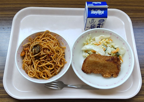 なすのミートソ-ススパゲッティ 牛乳 チキンカツ コールスローサラダ