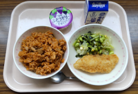 ジャンバラヤ 牛乳 白身魚のレモンフライ 枝豆のコーンのサラダ ぶどうゼリーエネ...