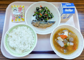 【節分献立】ごはん 牛乳 いわしのごまみそ煮 ささみとひじきのしょうがあえ けん...