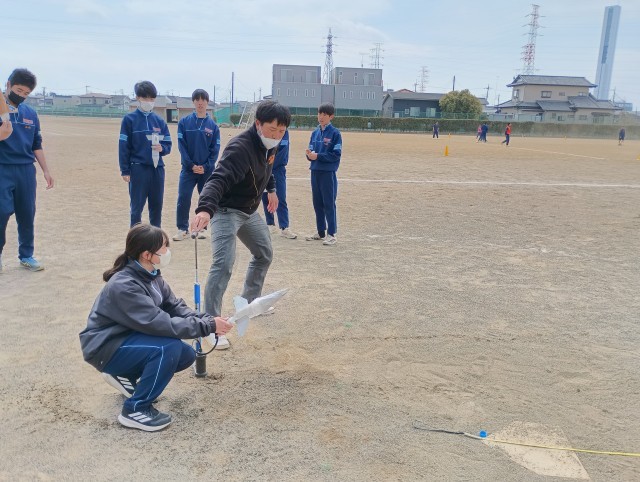 本日は理科の授業を参観しました。内容はペットボトルロケットの打ち上げでした。水の量やロケットのバランス、打ち上げる角度などを班員と考え、実行していました。写真に写るクラスの最長距離は42mほど。授業者曰く、今までの最高記録は70mを超えているそうです。