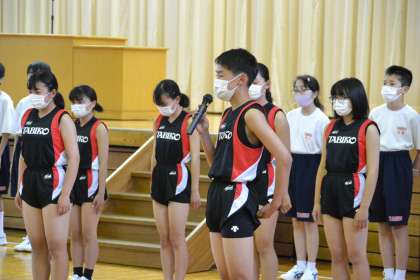 任命式の後、陸上競技部の総体壮行会を行いました。各種目の代表者が意気込みを語りました。それぞれの目標に向かって全力で頑張ってきてほしいです。