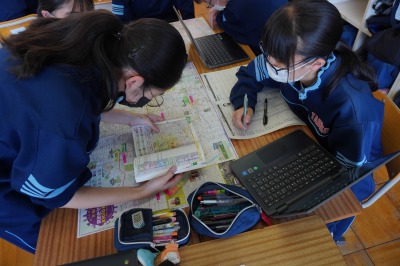 3年生の学年掲示板を覗くと、修学旅行に関係する資料が貼り出されていました。休み時間には生徒が地図を見ながら1か月後に控えた修学旅行を楽しみに談笑していました。総合の時間では、班別活動の計画を行っています。担任の先生と相談しながら、どの班も分単位での計画が作られています。入念に作られた計画を見ると生徒の修学旅行に対する楽しみな気持ちが伝わってきました。