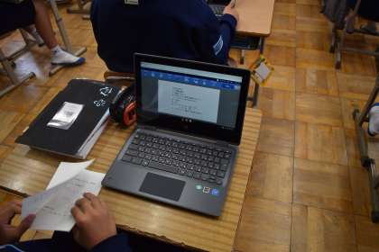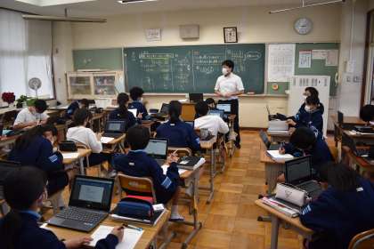 タブレットを活用した授業が行われています。みんな集中して数学の課題に取り組んでいます。